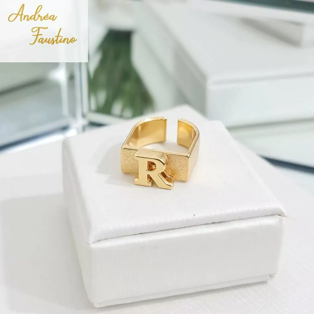 Esse anel dourado apresenta uma base quadrada, que confere um design contemporâneo e sofisticado. Na superfície da base, a sua inicial personalizada é gravada, tornando o anel único e especial.