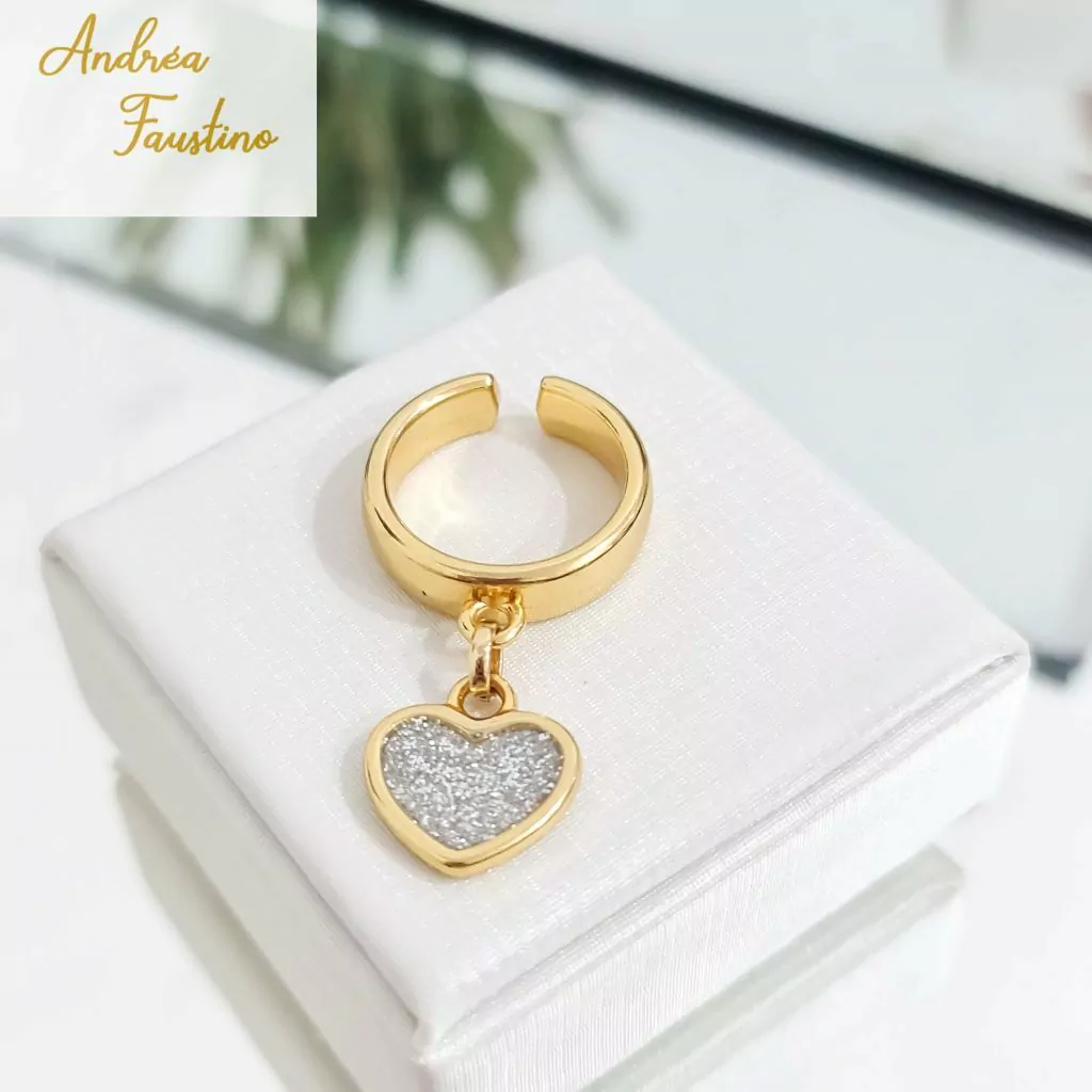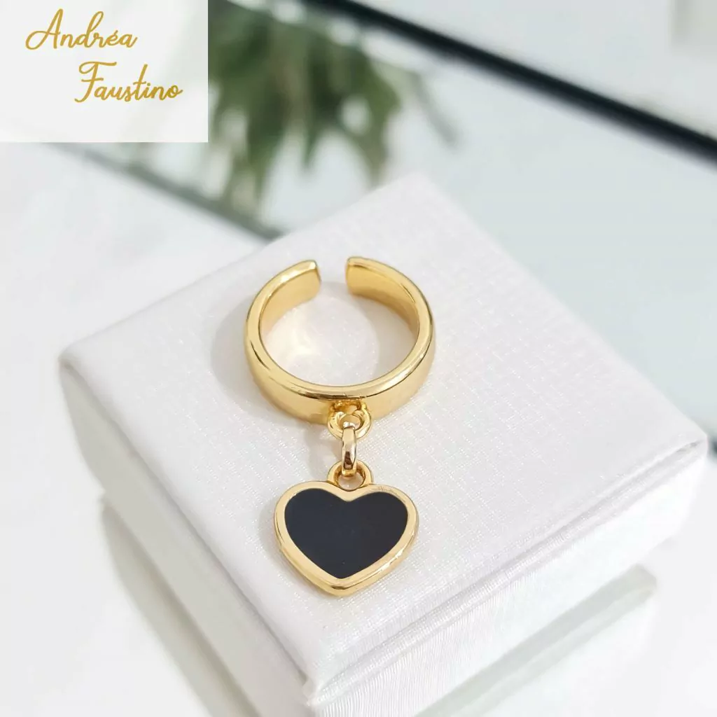 Apresentamos um elegante anel dourado regulável, que destaca um encantador pingente de coração. Você pode escolher entre as opções de coração preto, branco ou prata gliterinado, permitindo que você personalize a peça de acordo com seu estilo.