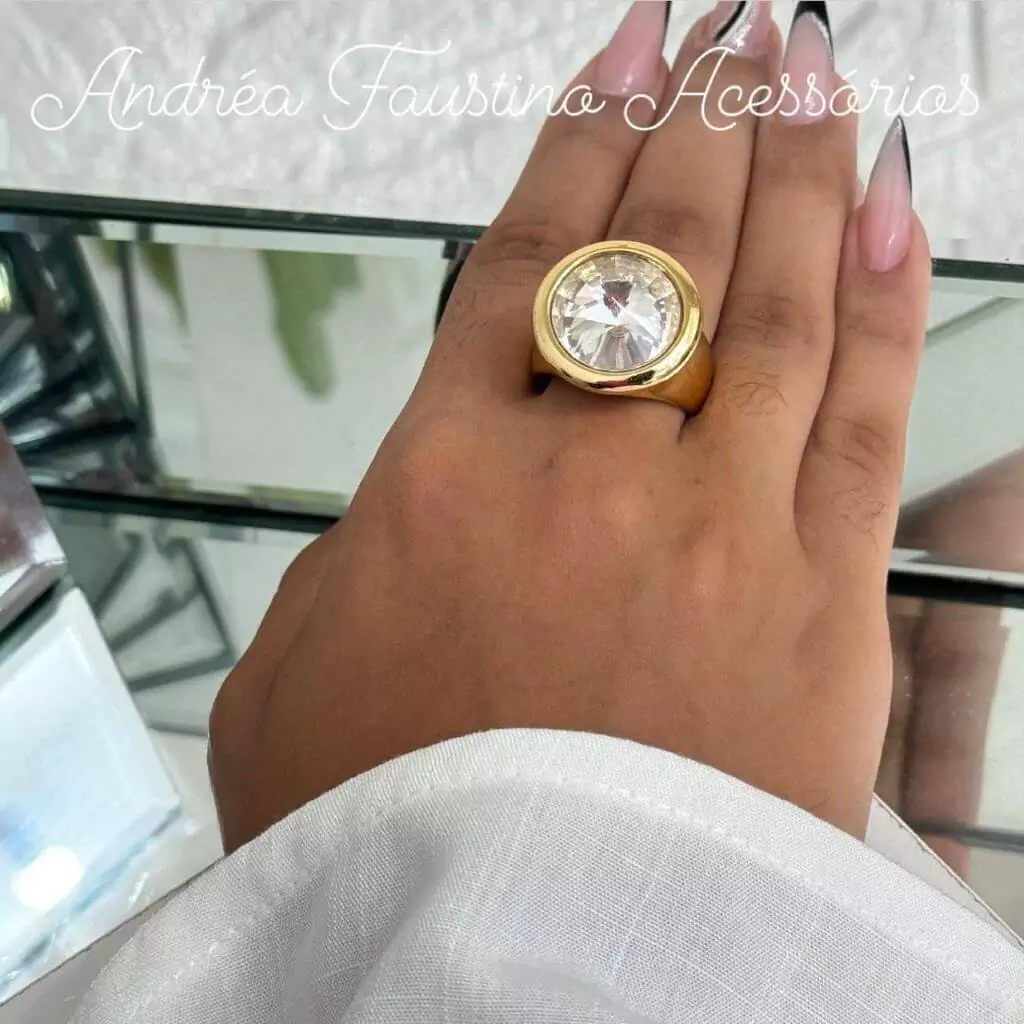 Este anel sofisticado e deslumbrante é cravejado com um brilho, proporcionando um visual radiante e luxuoso. Feito em metal dourado, seu design elegante e detalhado é perfeito para adicionar glamour e brilho a qualquer ocasião. Um acessório refinado que se destaca pelo seu esplendor e acabamento impecável.