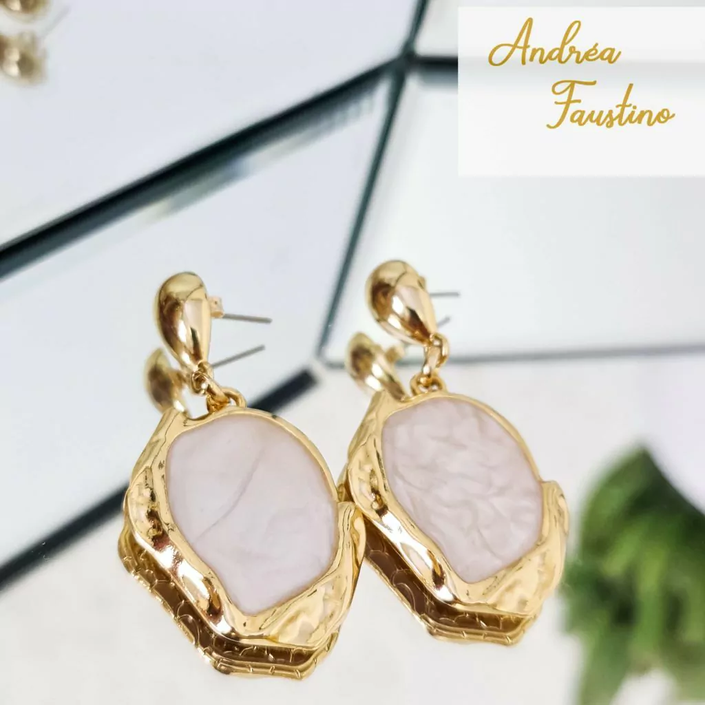Esse brinco apresenta um pino gota dourado, que confere um toque de sofisticação ao visual. O pingente de medalha, disponível nas elegantes cores madrepérola e preto, adiciona um detalhe distintivo e contemporâneo à peça.
