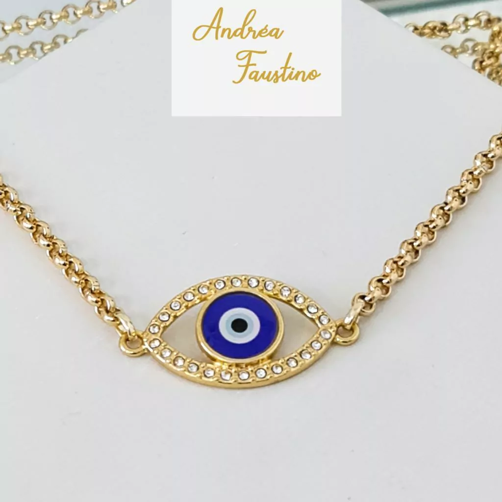Este colar dourado é uma peça delicada, confeccionada em corrente de elo português fina, que traz leveza e elegância ao visual. O fecho lagosta garante segurança e praticidade. O pingente de olho grego vertical, adornado com strass, é o destaque da peça, oferecendo um toque de proteção e brilho.