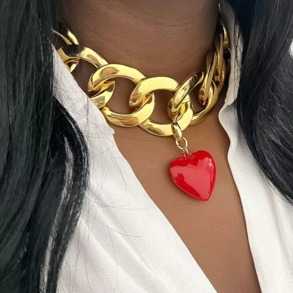 Uma chocker dourada marcante composta por elos largos, que traz um visual moderno e ousado. No centro, suspenso com destaque, é um pingente de coração vermelho vibrante, que adiciona um toque de cor e paixão à peça. O contraste entre o dourado brilhante dos elos e o vermelho intenso do coração cria um equilíbrio entre sofisticação e personalidade, tornando a gargantilha um acessório poderoso e cheio de estilo, perfeito para compor looks arrojados e expressivos.