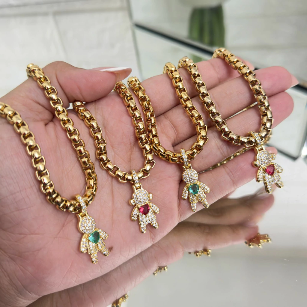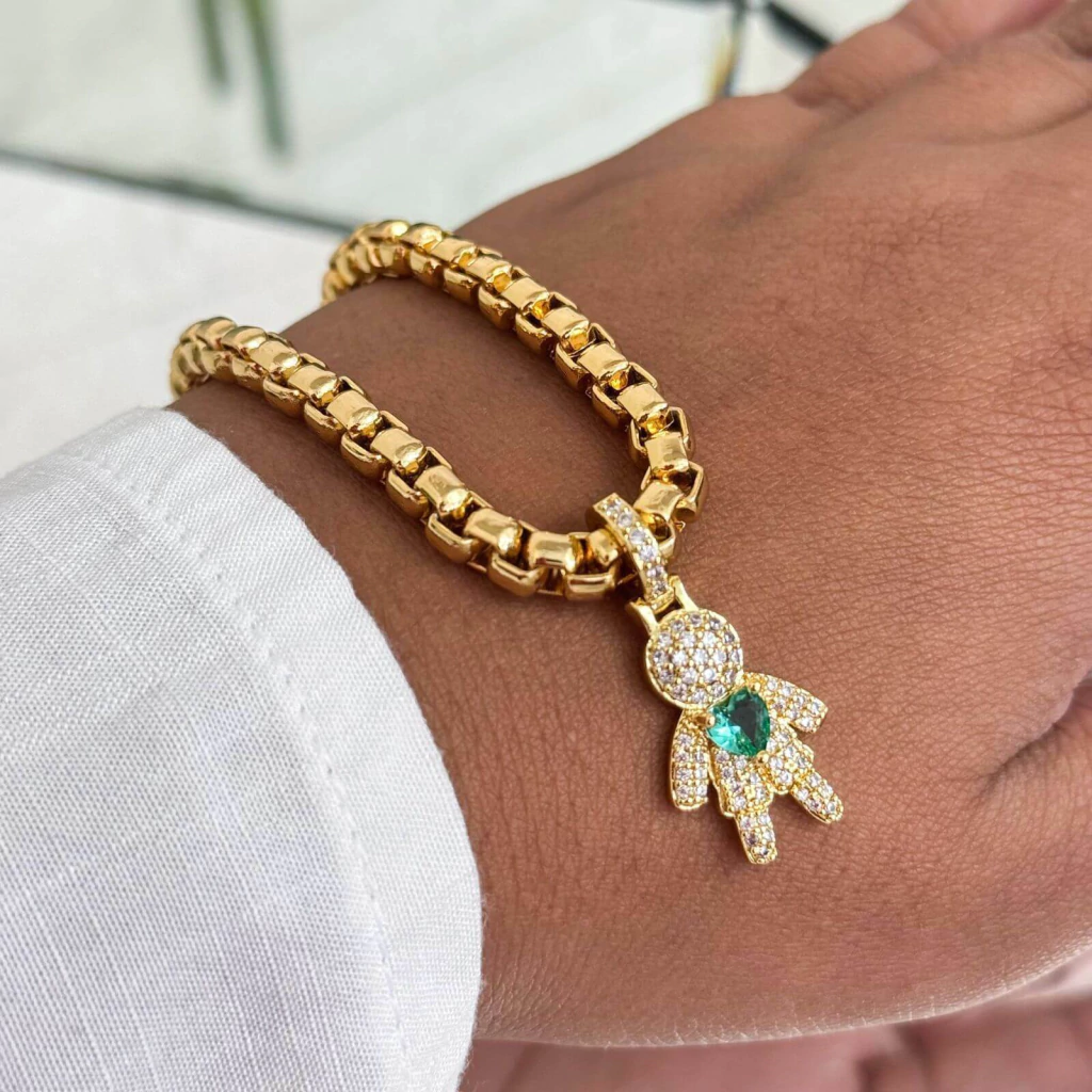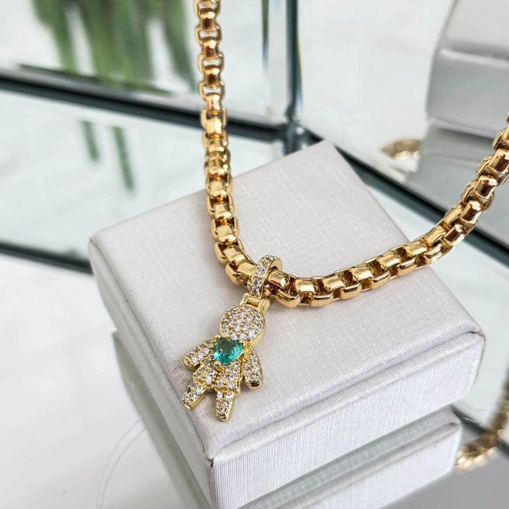 Esse colar em corrente veneziana dourada é robusto e luxuoso, destacando-se pelo brilho e acabamento impecável. O pingente em formato de bonequinho, totalmente cravejado de zircônias, apresenta um toque de sofisticação e delicadeza. Cada peça é enriquecida com uma pedra central colorida em forma de coração, tornando-o perfeito para simbolizar um filho ou uma pessoa especial, trazendo emoção e elegância em um acessório único. Ideal para quem busca uma joia cheia de significado e estilo.