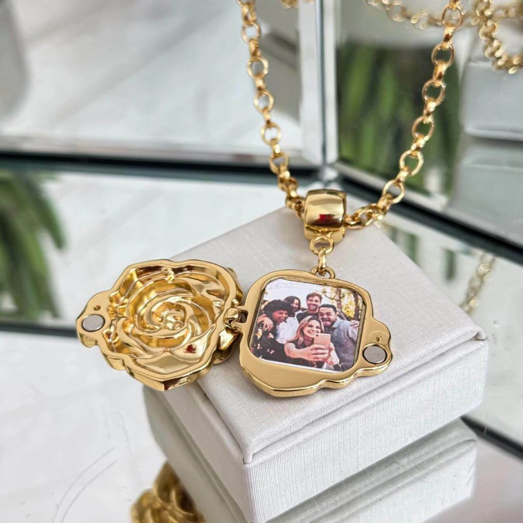 Este colar dourado apresenta uma elegante corrente elo português fina, que confere brilho e sofisticação, com acabamento em fecho lagosta para maior conforto e segurança. O pingente de relicário em formato de flor é personalizável, permitindo que você insira a foto que desejar, tornando a peça única e cheia de significado. Envie sua foto para o e-mail: [email protected] e tenha um colar exclusivo, perfeito para carregar suas lembranças de forma delicada e especial.