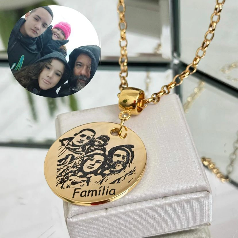 Medalha gravada com a caricatura de sua família, e logo abaixo, a palavra "família" como uma homenagem especial!