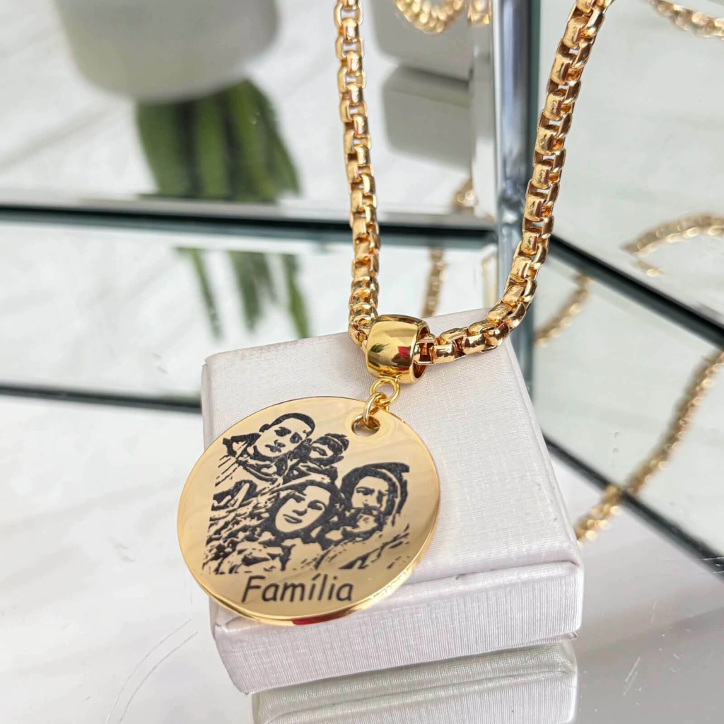 Medalha gravada com a caricatura de sua família, e logo abaixo, a palavra "família" como uma homenagem especial!