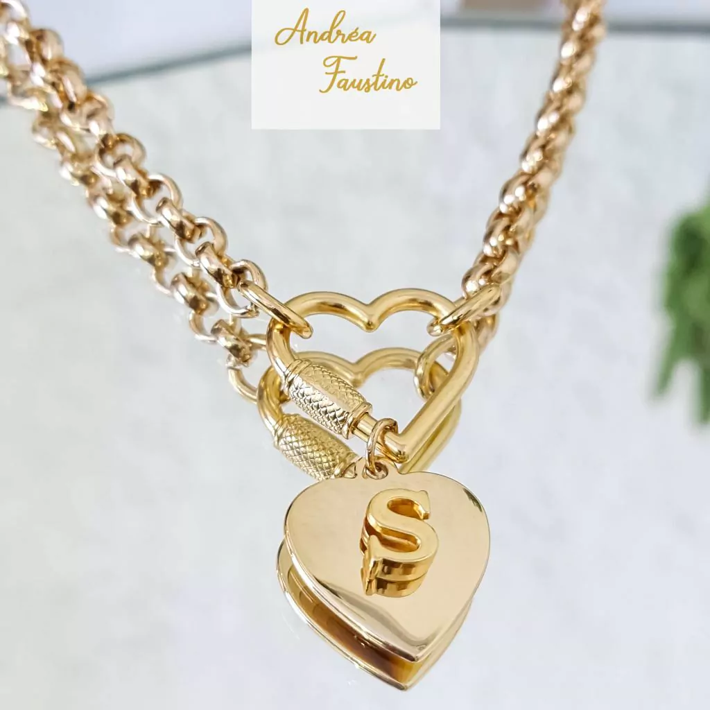 Este colar dourado possui uma corrente de elo português grossa, que confere um visual ousado e marcante. O fecho mosquete em formato de coração adiciona um toque romântico e funcional ao design. O destaque é o pingente de coração chapado, personalizado com a sua inicial em cima, tornando a peça única e especial.