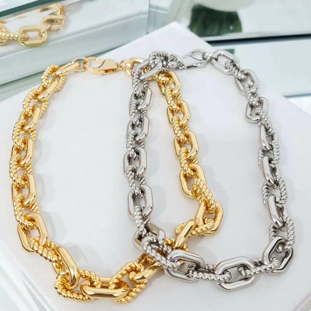 Esta choker é uma peça deslumbrante, confeccionada em corrente de elos riscados que proporciona um visual moderno e elegante. O acabamento em fecho lagosta garante segurança e facilidade ao usar. Disponível nas cores prata e dourado, esta choker é versátil e perfeita para qualquer ocasião, podendo ser usada sozinha ou combinada com outros acessórios.