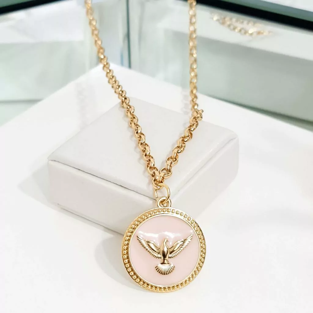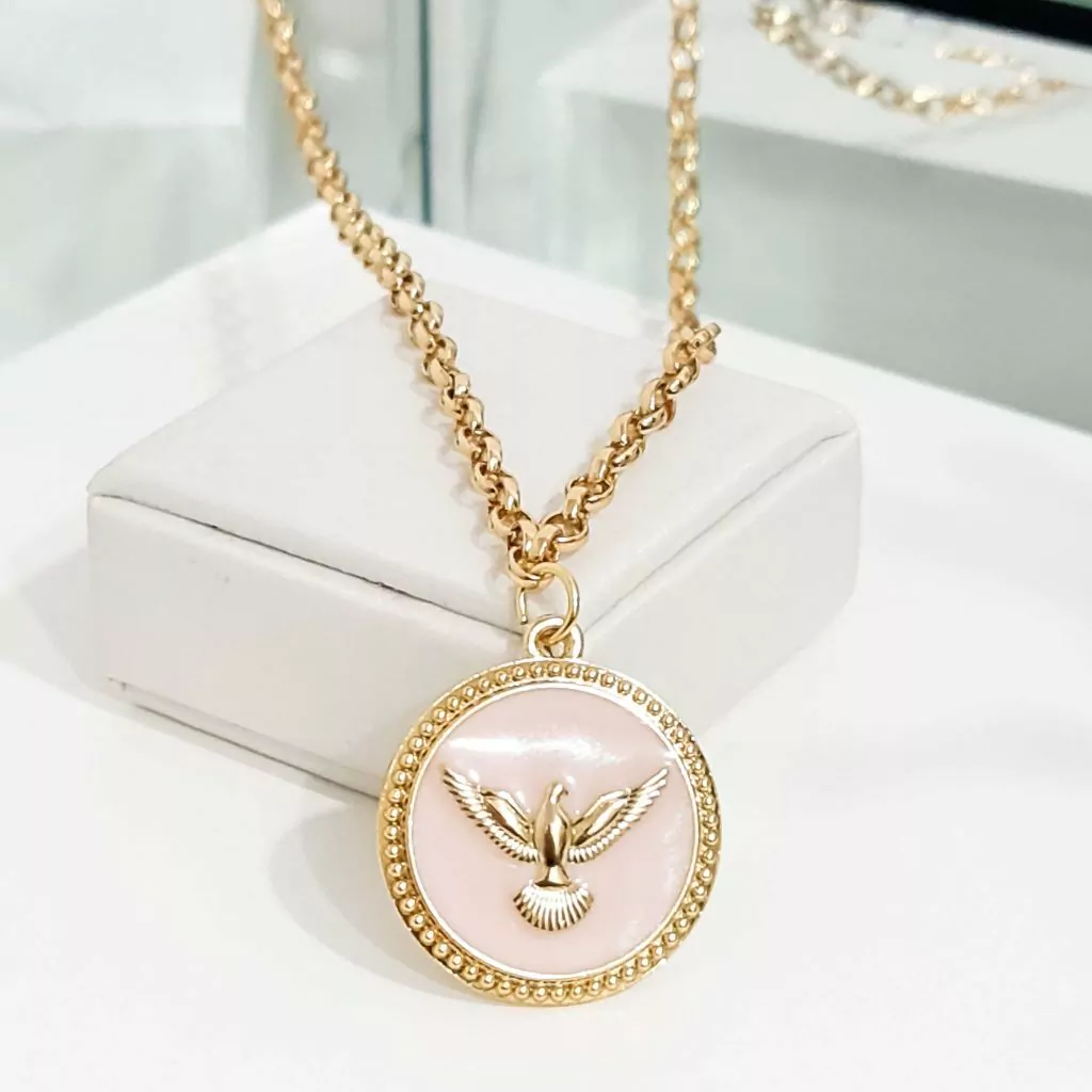 Esse colar dourado é confeccionado em corrente de elos portugueses finos, que oferece um visual delicado e elegante. O acabamento em fecho lagosta garante segurança e facilidade ao usar. O destaque da peça é o pingente de medalha com a imagem da pomba da paz, simbolizando harmonia e tranquilidade.
