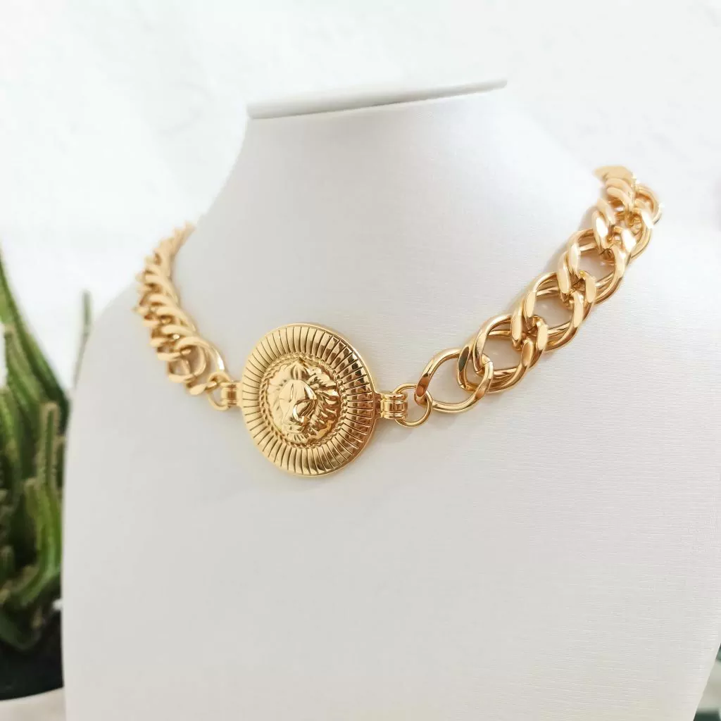 Essa choker dourada é confeccionada com uma corrente max grossa, que confere um visual ousado e impactante. O acabamento em fecho lagosta garante segurança e praticidade ao usar. Um toque especial da peça são os passa tiras em animal print de leão, que adicionam um elemento de estilo e personalidade, trazendo um ar selvagem e moderno à choker.