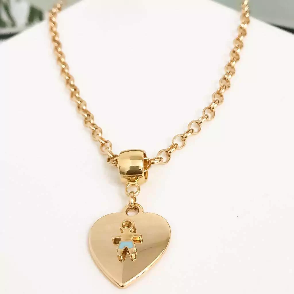 Esse colar dourado é uma peça delicada e cheia de charme, apresentando um pingente de coração dourado chapado que irradia elegância. Acompanhado por um pingente de bonequinho, o colar adiciona um toque pessoal e afetuoso, perfeito para expressar amor e carinho.