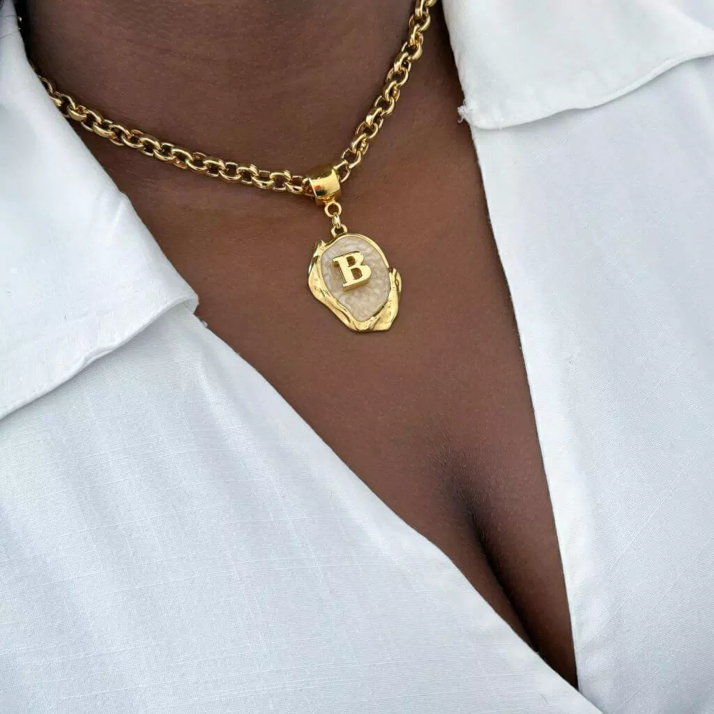 Esse colar dourado apresenta uma corrente de elos portugueses grossos, criando um visual imponente e sofisticado. O destaque da peça é o pingente de medalha, onde no centro é gravada a sua inicial personalizada, tornando o colar exclusivo e significativo. As medalhas estão disponíveis em duas opções elegantes: preto, que oferece um contraste marcante e moderno, e madrepérola, que adiciona um toque suave e clássico.