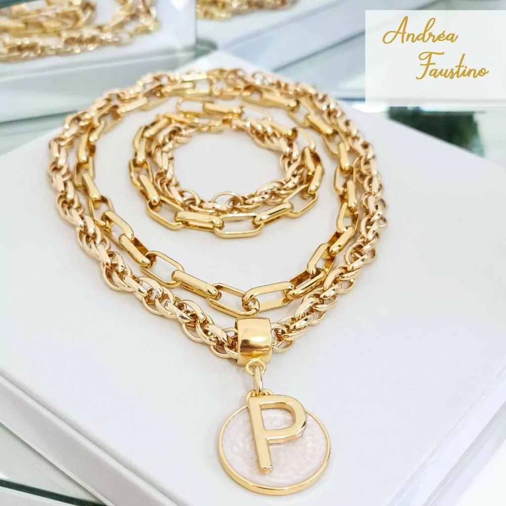 Este elegante kit inclui um colar em corrente trançada, uma choker em corrente de elos e duas pulseiras: uma na corrente trançada e outra na corrente de elos. O colar destaca-se com um pingente de medalha que em cima vai um pingente com a sua inicial personalizada! Tornando a peça ainda mais especial. As medalhas estão disponíveis nas cores bege, preto e dourado, oferecendo opções versáteis para combinar com seu estilo.