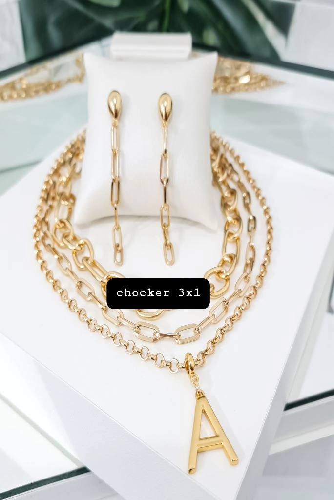 Apresentamos um elegante kit de colar,duas chocker e brinco em dourado, perfeito para complementar qualquer look. O colar é confeccionado em corrente e o português, adornado com um delicado pingente da inicial de sua escolha, trazendo um toque pessoal. As gargantilhas oferecem a opção de corrente chapada ou corrente 3x1, permitindo que você escolha o estilo que mais combina com você. Para finalizar, os brincos possuem um pino gota dourado, com uma charmosa corrente retangular suspensa, proporcionando um brilho sutil e sofisticado.