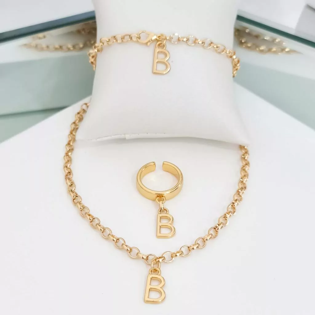 O kit de colar, pulseira e anel dourados é uma coleção elegante e personalizada, ideal para quem aprecia acessórios que refletem sua identidade. Cada peça pode ser gravada com a inicial que você escolher, tornando o conjunto único e especial. O anel é regulável, garantindo um ajuste confortável e perfeito para qualquer dedo.