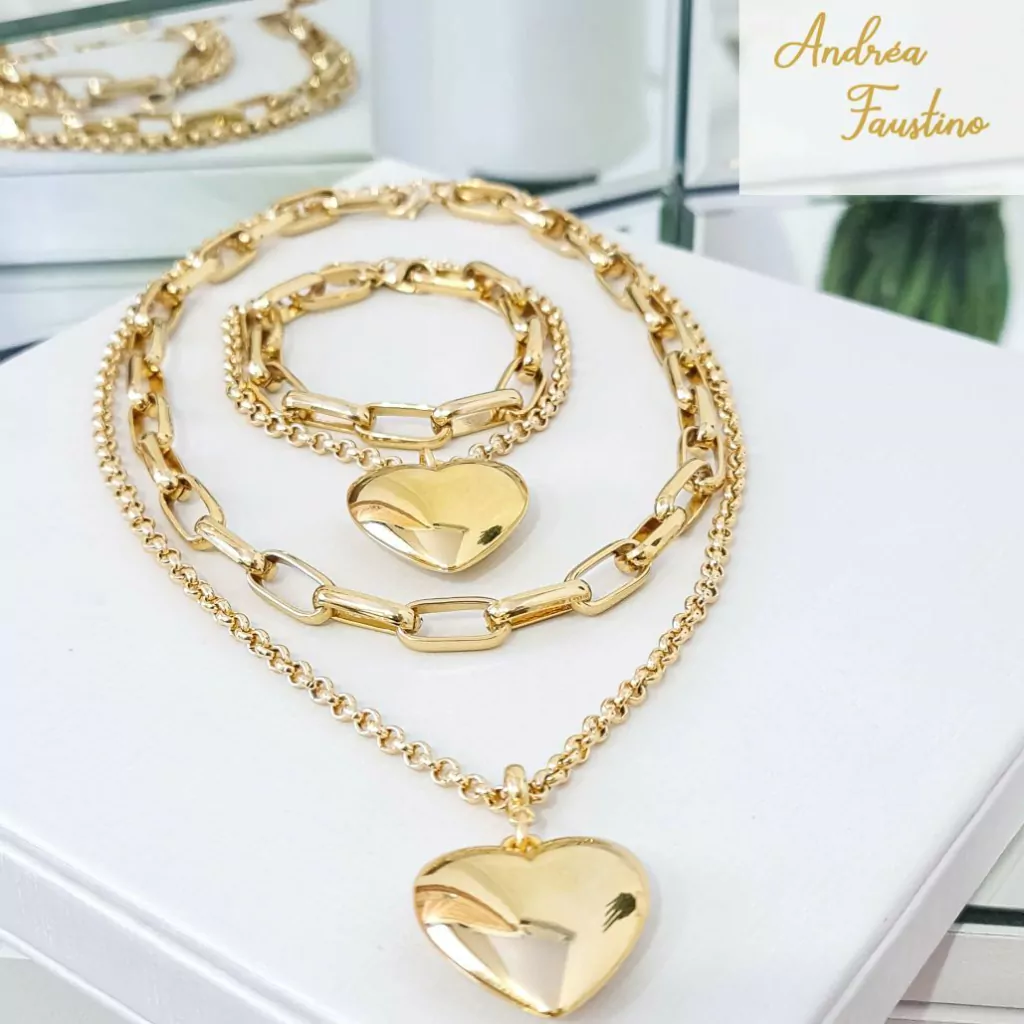 Este conjunto elegante é composto por um colar, uma choker e uma pulseira, todos em dourado e com um design sofisticado. O colar é confeccionado em corrente de elo português, oferecendo um visual clássico e refinado. O destaque é o pingente de coração maciço, que adiciona um toque romântico e ousado à peça, tornando-a perfeita para várias ocasiões. A choker é feita em corrente de elos, que traz um charme contemporâneo e versátil. A pulseira é de duas voltas, uma em elo português e a outra em corrente de elos, criando um visual interessante e dinâmico no pulso. Assim como o colar, ela também apresenta um pingente de coração maciço.
