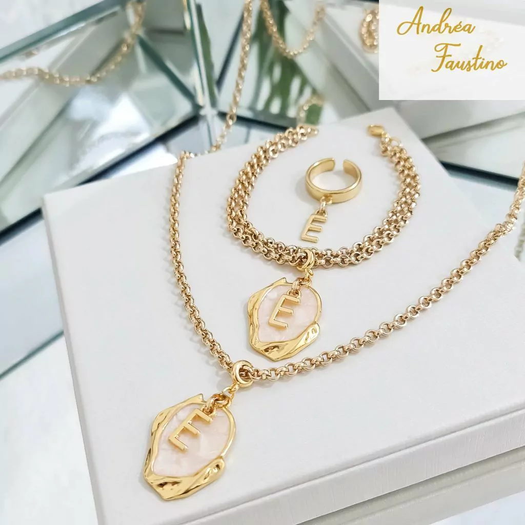 Esse kit elegante é composto por três peças deslumbrantes, todas projetadas para trazer um toque de personalização e sofisticação ao seu estilo. O colar é feito em corrente de elos portugueses finos, com acabamento em fecho lagosta. Ele conta com um pingente de medalha disponível nas cores preta ou madrepérola, onde você pode personalizar com a inicial da letra que desejar, tornando-o único e especial. A pulseira dourada de duas voltas também apresenta uma corrente de elos portugueses e um pingente de medalha nas mesmas opções de cores. Assim como o colar, ela pode ser personalizada com a inicial que você escolher e para completar o conjunto, o anel dourado é regulável e apresenta um pingente com a inicial personalizada, permitindo um ajuste confortável e um toque final de elegância.