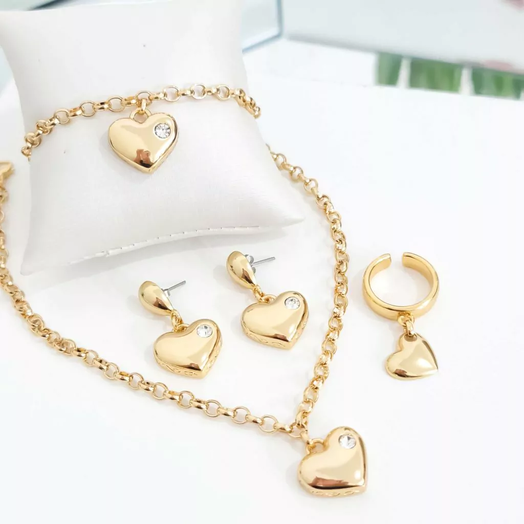 O kit de colar, pulseira, anel e brinco dourados é uma coleção encantadora e elegante, perfeita para quem aprecia detalhes sofisticados. Os colar, pulseira e brinco apresentam pingentes de coração dourado adornados com strass, que adicionam um brilho especial e um toque de glamour. O anel, embora sem strass, complementa perfeitamente as outras peças com seu design simples e refinado.