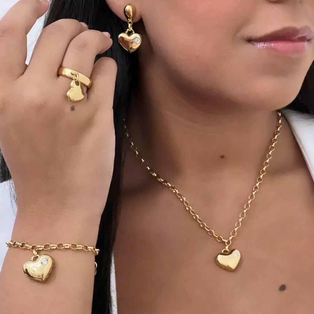 Pingente de coração dourado com strass (colar,pulseira e brinco) medindo 18MM!