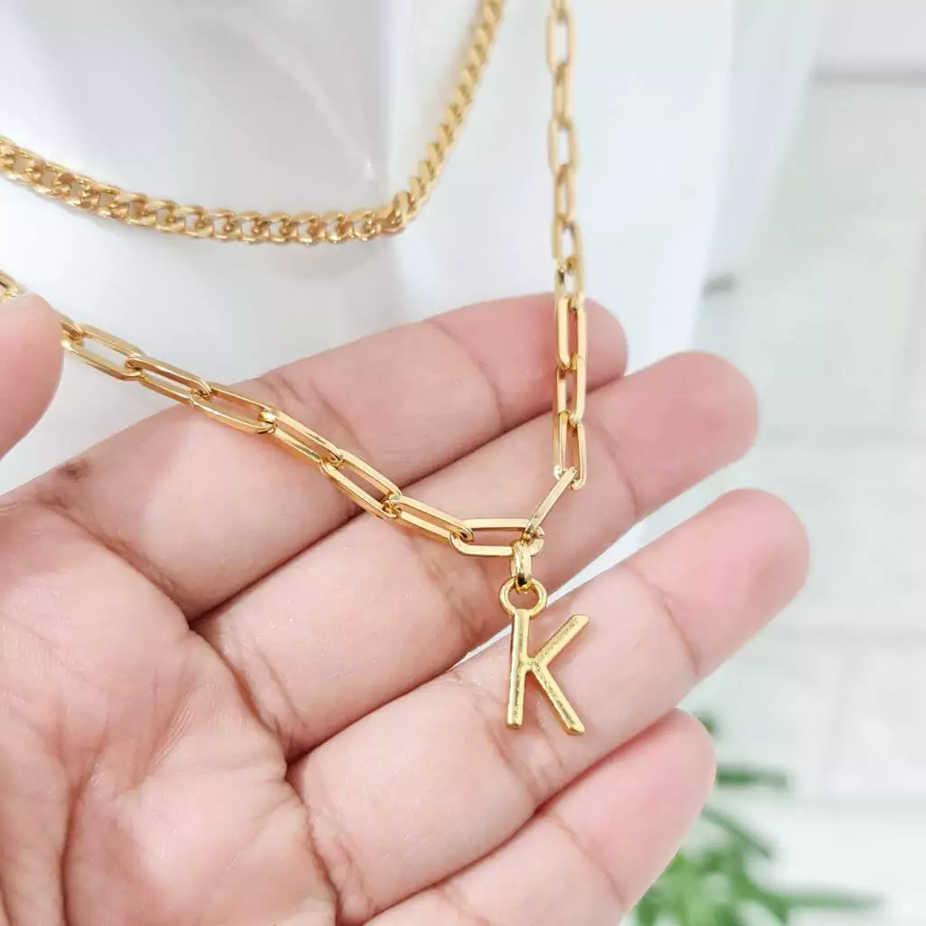 O colar dourado de duas voltas apresenta um design elegante e moderno, com um pingente de inicial que pode ser personalizado conforme a sua escolha. As duas camadas adicionam profundidade e estilo, tornando-o perfeito para destacar a inicial de forma única.