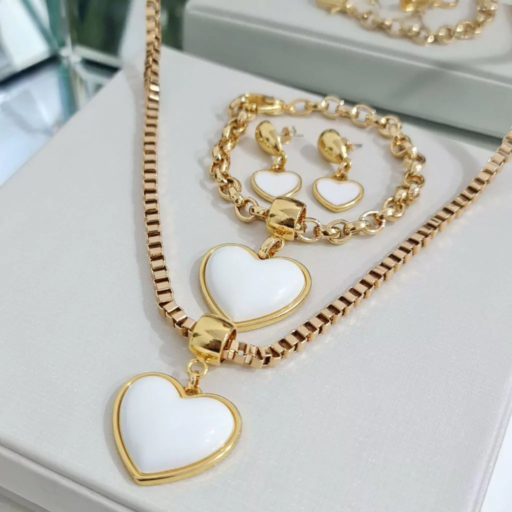 Este encantador kit de colar, pulseira e brinco dourados é perfeito para quem ama um toque de elegância e delicadeza. Cada peça apresenta um lindo pingente de coração branco, que simboliza amor e pureza. O colar, com sua corrente refinada, complementa a pulseira, que é ajustável e confortável no pulso. Os brincos, com design suspenso, acrescentam um charme extra ao conjunto.