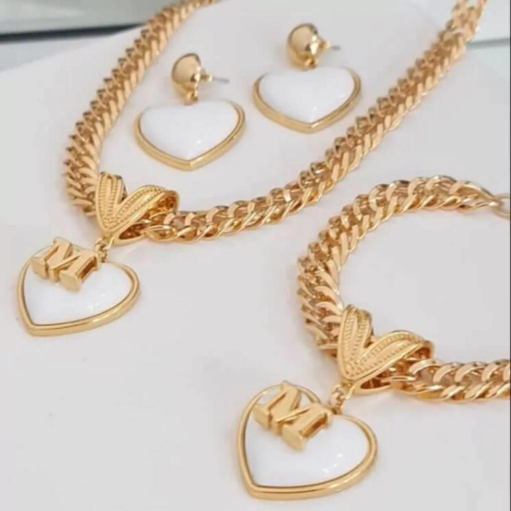 Este deslumbrante kit de colar, pulseira e brinco é perfeito para quem busca elegância e personalização. O colar e a pulseira são confeccionados em corrente grumet dourada, ambos adornados com um pingente de coração branco, que pode ser personalizado com a inicial da sua escolha, trazendo um toque único e significativo. O brinco complementa o conjunto com um delicado coração branco, criando uma harmonia visual encantadora.