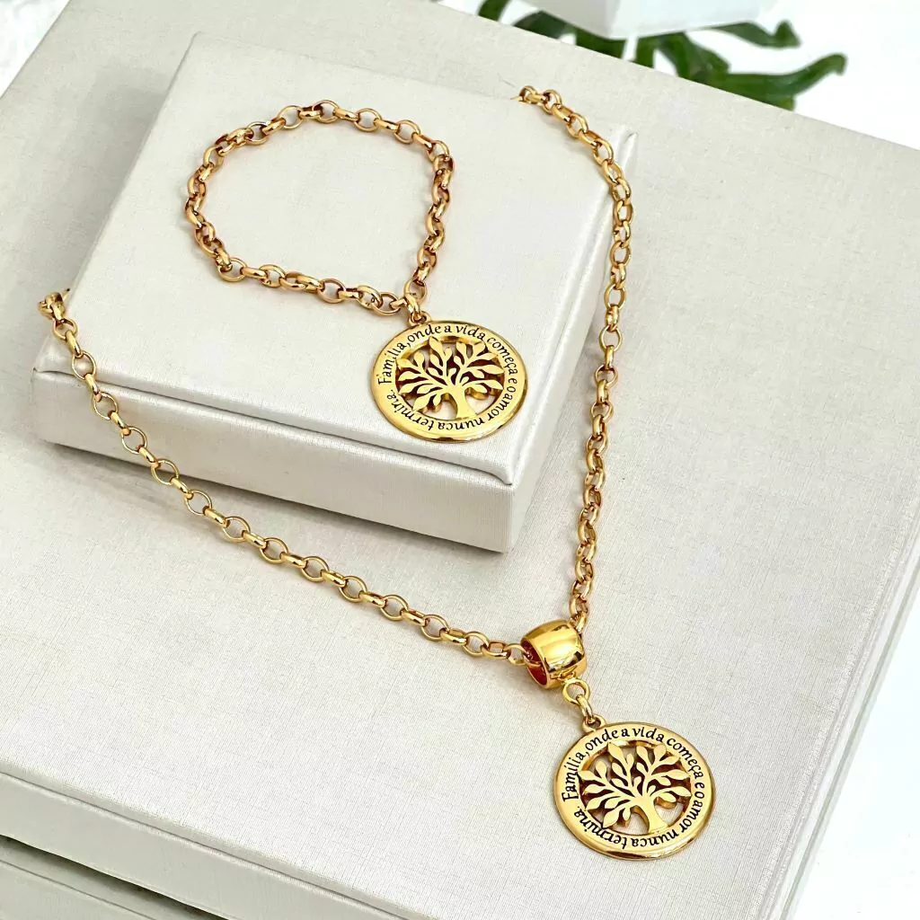Este kit encantador inclui um colar e uma pulseira dourada, ambos adornados com um elegante pingente da árvore da vida. O colar apresenta uma corrente delicada que realça a beleza do pingente, enquanto a pulseira complementa o conjunto com um design harmonioso e sofisticado. A árvore da vida simboliza conexão e renovação, tornando este conjunto não apenas um acessório estiloso, mas também uma peça repleta de significado.