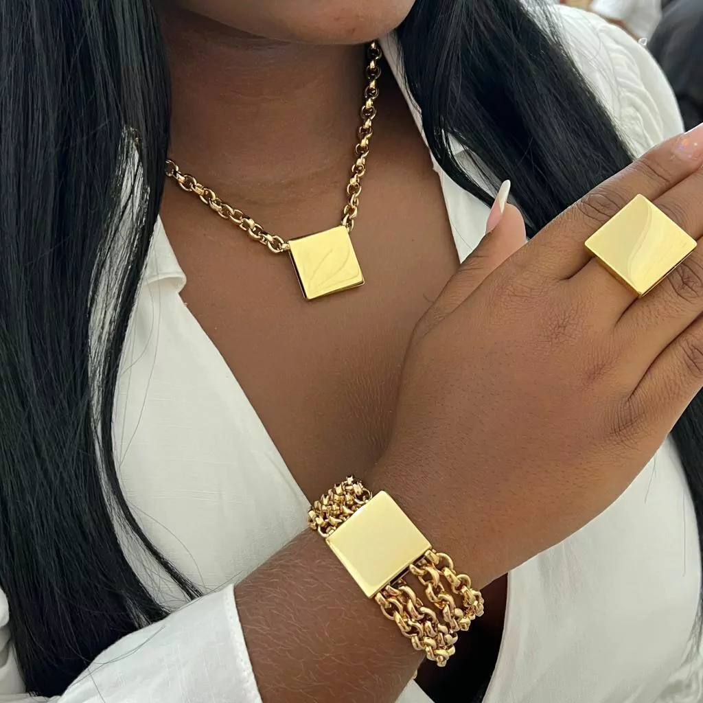 Esse kit de joias é composto por um colar dourado, uma pulseira de várias voltas e um anel, todos com pingentes de placa, criando uma harmonia sofisticada. O colar, com sua corrente delicada, apresenta uma placa elegante que pode ser personalizada, enquanto a pulseira de várias voltas adiciona um toque de textura e estilo. O anel complementa o conjunto com um design simples e contemporâneo.
