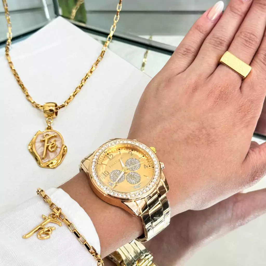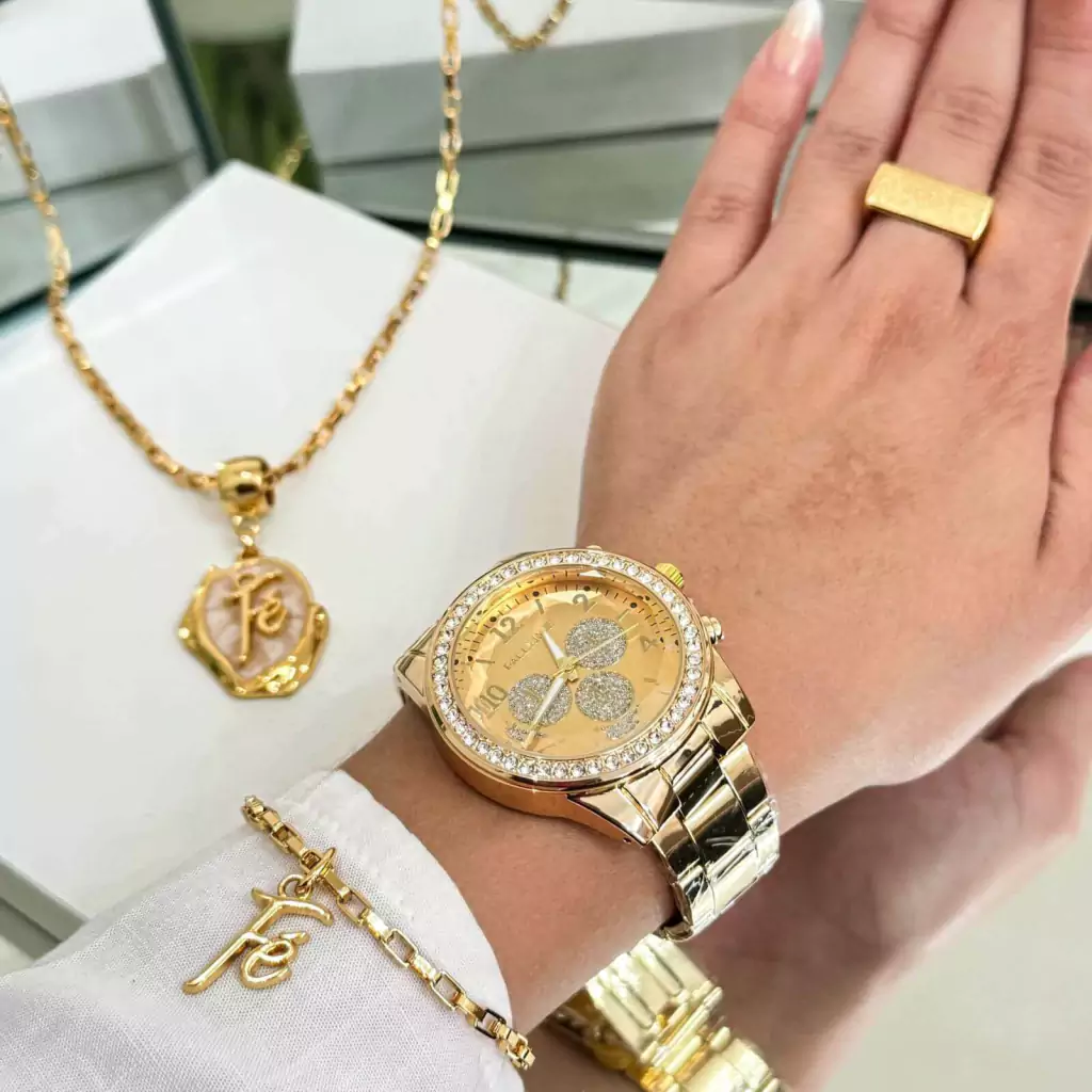 Um conjunto que une elegância e espiritualidade, perfeito para quem busca um toque de fé no visual. O kit inclui um colar com corrente quadrada e pingente de medalha de madrepérola com a palavra "Fé", uma pulseira delicada em corrente quadrada com pingente também da palavra "Fé", um sofisticado relógio dourado com strass da marca Pallyjane, e um anel dourado regulável que complementa com brilho e sofisticação. Ideal para quem deseja expressar fé, proteção e estilo em um único conjunto.