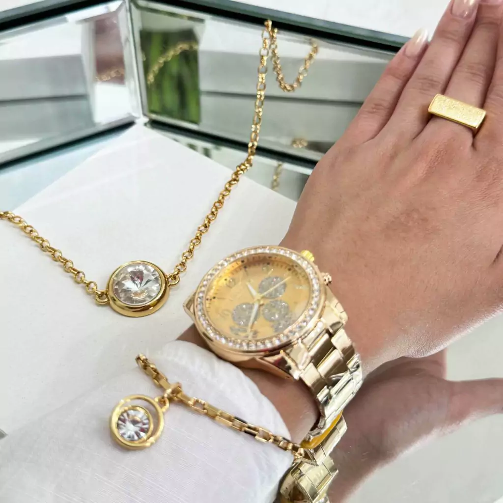 Este kit elegante combina peças delicadas e brilhantes para um visual sofisticado. O colar apresenta uma corrente quadradinha com um pingente de pedra de strass, que adiciona um toque de brilho discreto e encantador. A pulseira acompanha o estilo, também com corrente quadradinha e pingente de pedra de strass, criando uma harmonia no conjunto. O relógio dourado da marca Pallyjane, adornado com strass, traz um toque de glamour e sofisticação, enquanto o anel dourado regulável completa o kit com estilo e versatilidade, ajustando-se perfeitamente ao dedo. Um conjunto ideal para quem aprecia elegância e brilho.