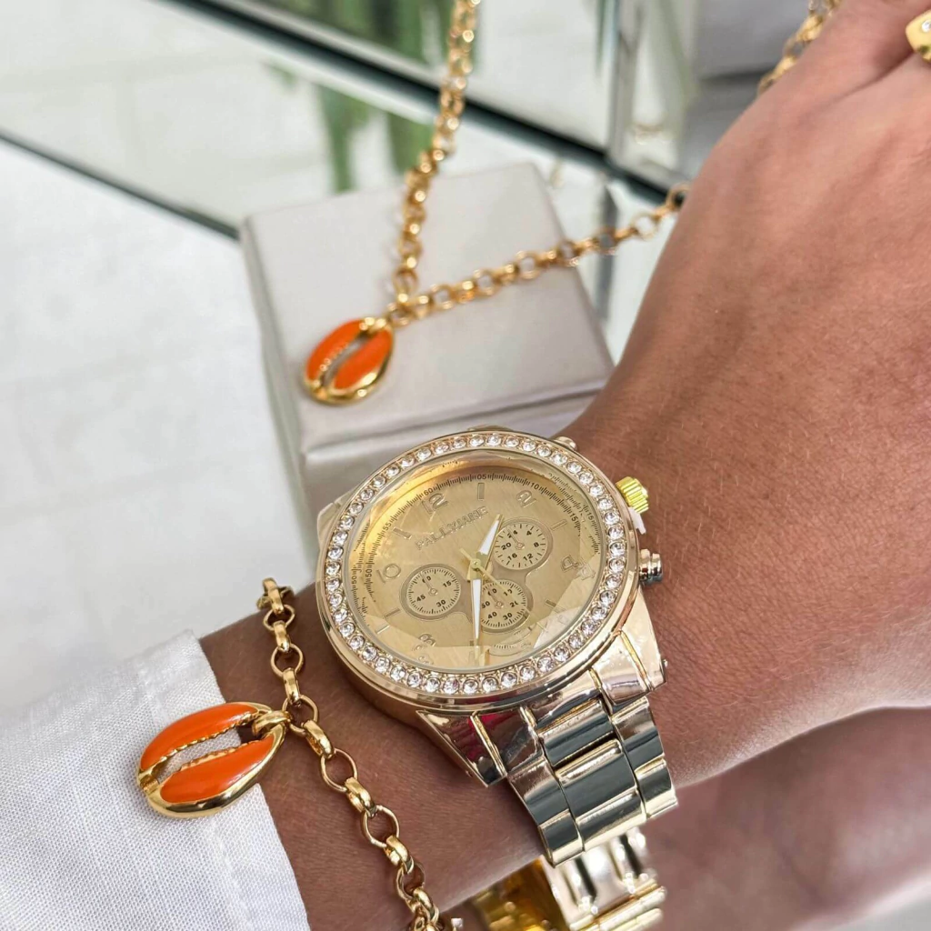 Este kit vibrante inclui o relógio dourado com strass PallyJane, resistente à água, trazendo estilo e praticidade para o seu dia a dia. Acompanhando o relógio, o conjunto conta com uma pulseira e colar em corrente elo português fina, com acabamento em fecho lagosta, garantindo conforto e segurança. Ambos os acessórios possuem pingentes de búzios laranja, trazendo um toque de cor e um charme praiano. O kit é complementado por um anel regulável (numeração 24), com um delicado pingente de peixe, adicionando um toque de leveza e sofisticação. Ideal para quem busca um look moderno, alegre e cheio de personalidade!