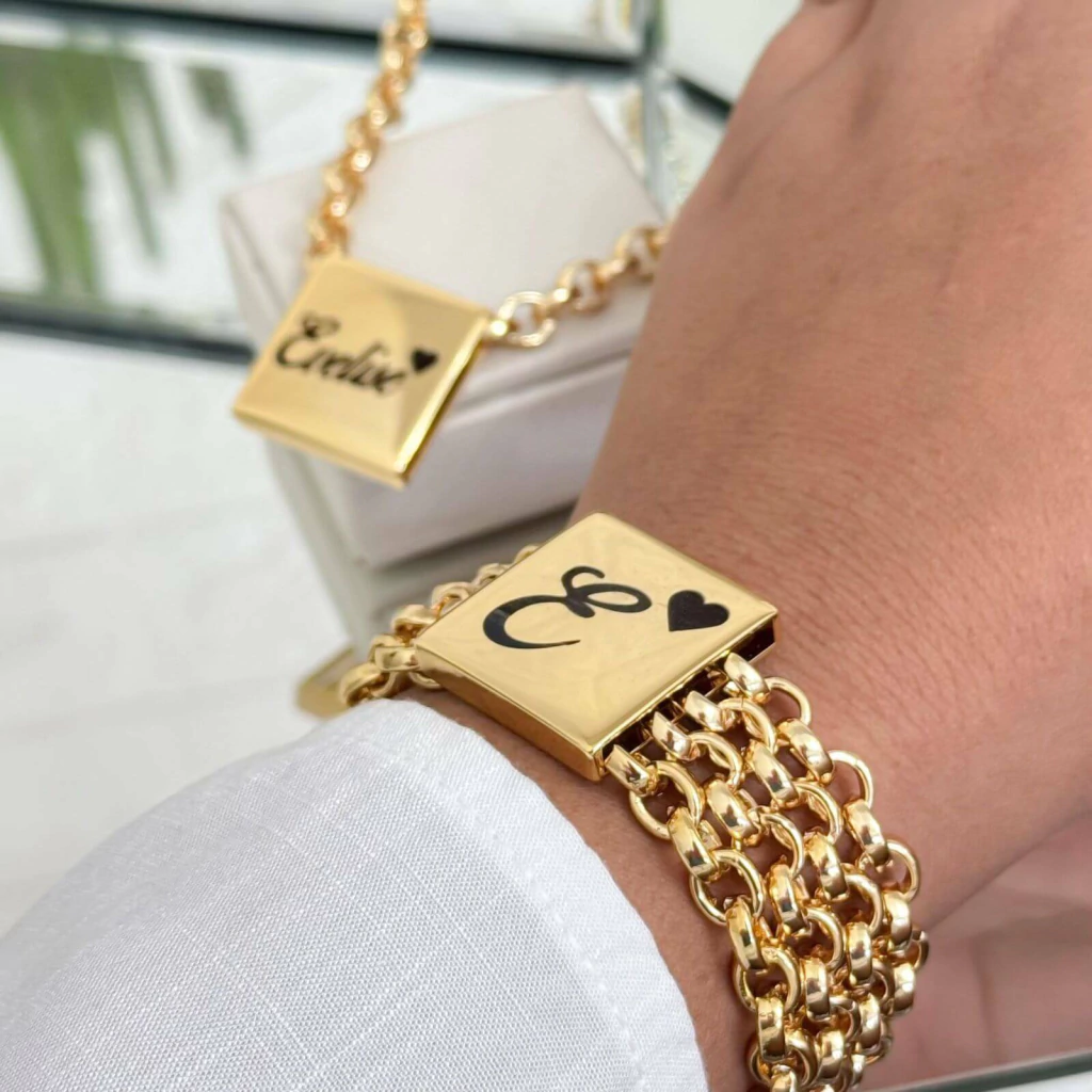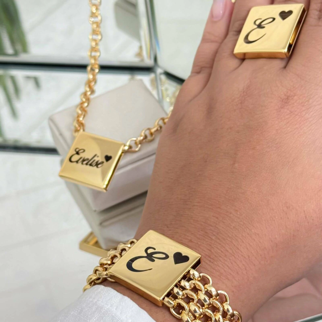 Além disso, o kit é totalmente personalizável, incluindo o Anel de Placa, Colar e Pulseira, que podem ser gravados a laser com o texto ou design que você preferir. Perfeito para quem busca peças únicas e exclusivas, cheias de estilo e personalidade!