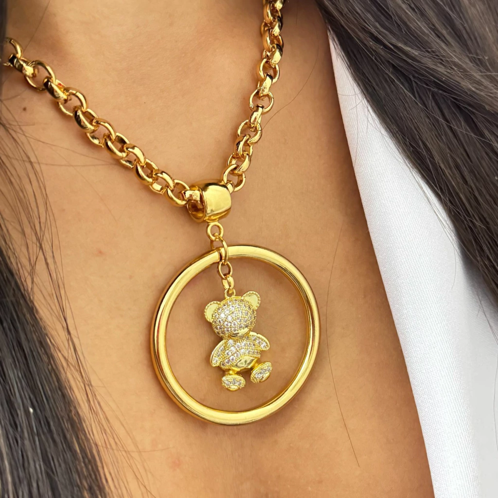 Colar dourado em corrente elo português grossa e com pingente de Urso Cravejado e Argola ao redor!