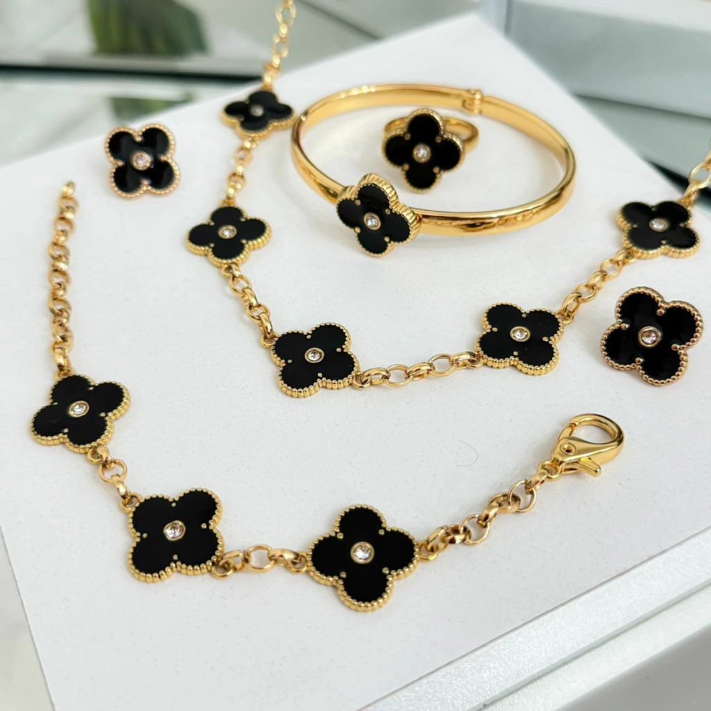 O conjunto também conta com: Bracelete Trevo medindo 68MM e com fecho encaixe! / Brinco Trevo medindo 18MM! Anel de Trevo Regulável! Colar e Pulseira com acabamento final em fecho lagosta!