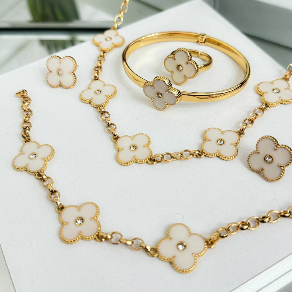 O conjunto também conta com: Bracelete Trevo medindo 68MM e com fecho encaixe! / Brinco Trevo medindo 18MM! Anel de Trevo Regulável! Colar e Pulseira com acabamento final em fecho lagosta!
