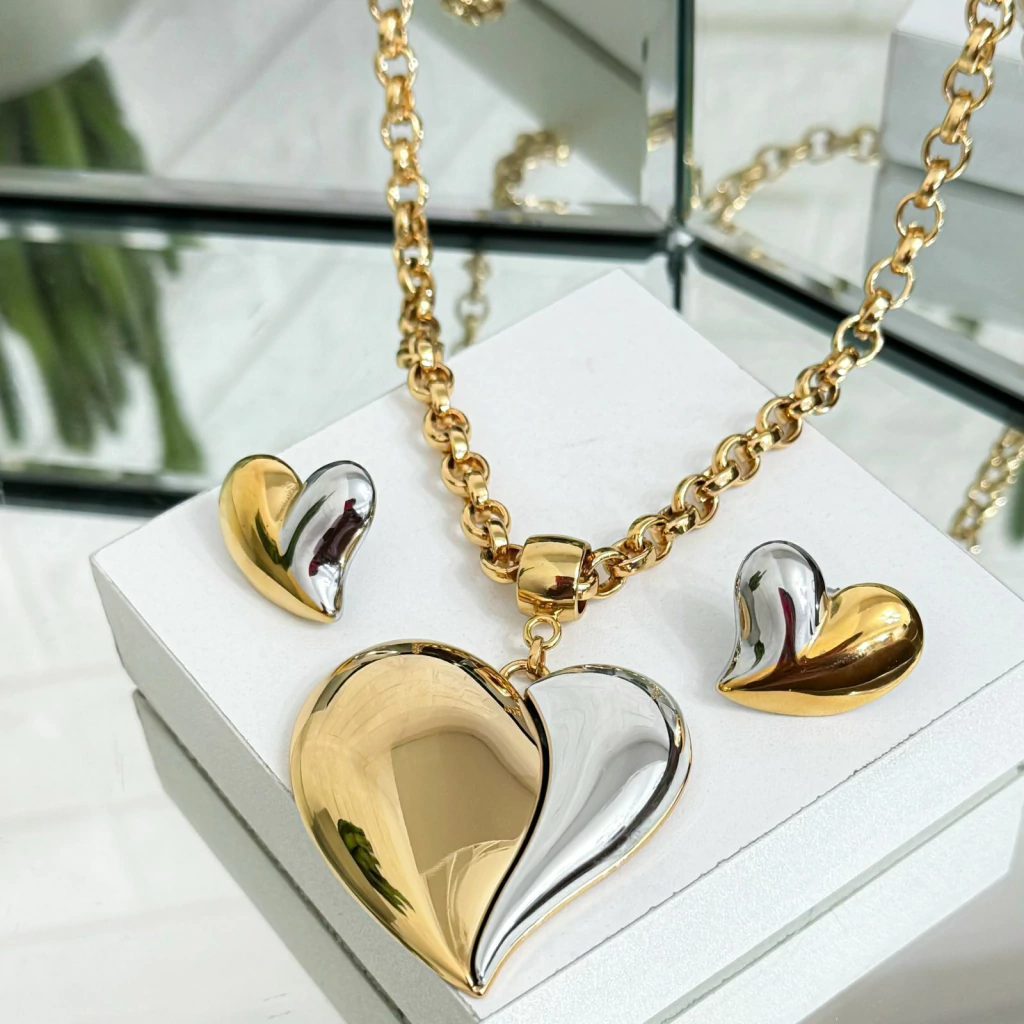 Colar dourado em corrente elo português grossa e com acabamento em fecho lagosta! Colar com pingente de Coração Bicolor medindo 50MM! O conjunto acompanha um par de Brincos de Coração Bicolor!