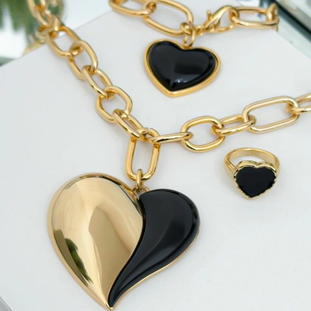 Colar dourado em corrente 3x1 e com acabamento em fecho lagosta! O conjunto também acompanha: Pulseira em corrente 3x1 e com acabamento em fecho lagosta e Anel de Coração Preto de dedo mínimo!