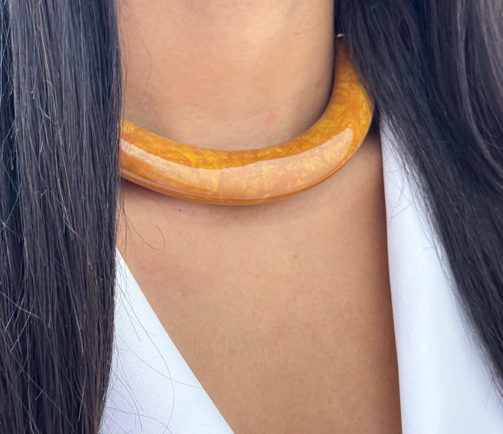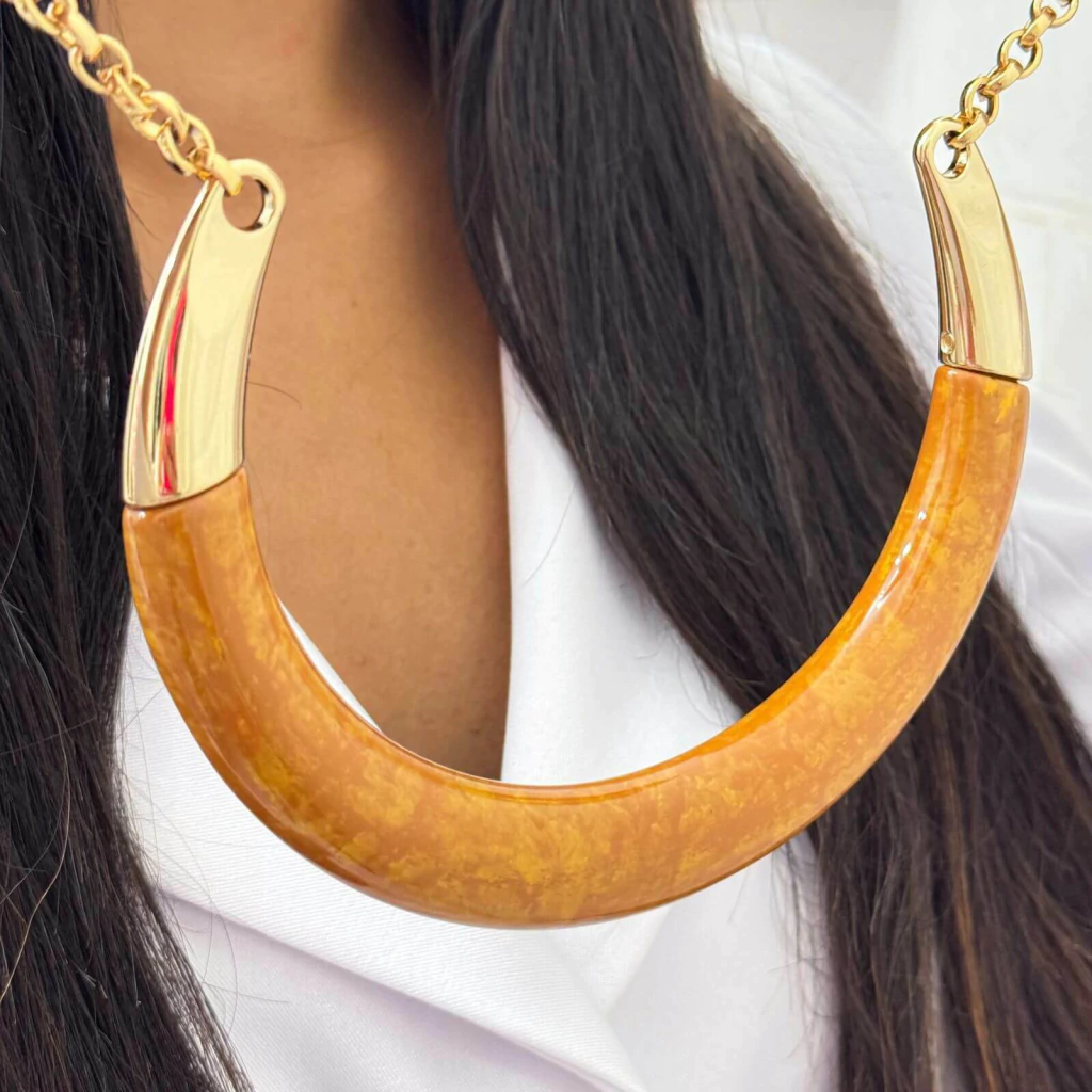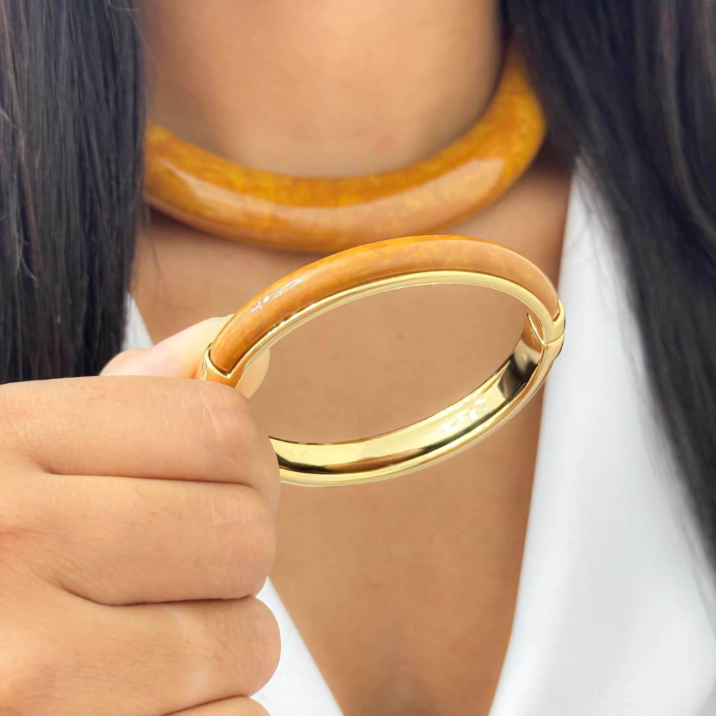 Conjunto sofisticado composto por um chocker caramelo grosso com acabamento em fecho lagosta, e um bracelete caramelo elegante com fecho encaixe. Perfeito para quem busca um toque de estilo moderno e clássico ao mesmo tempo!