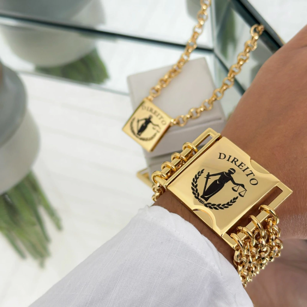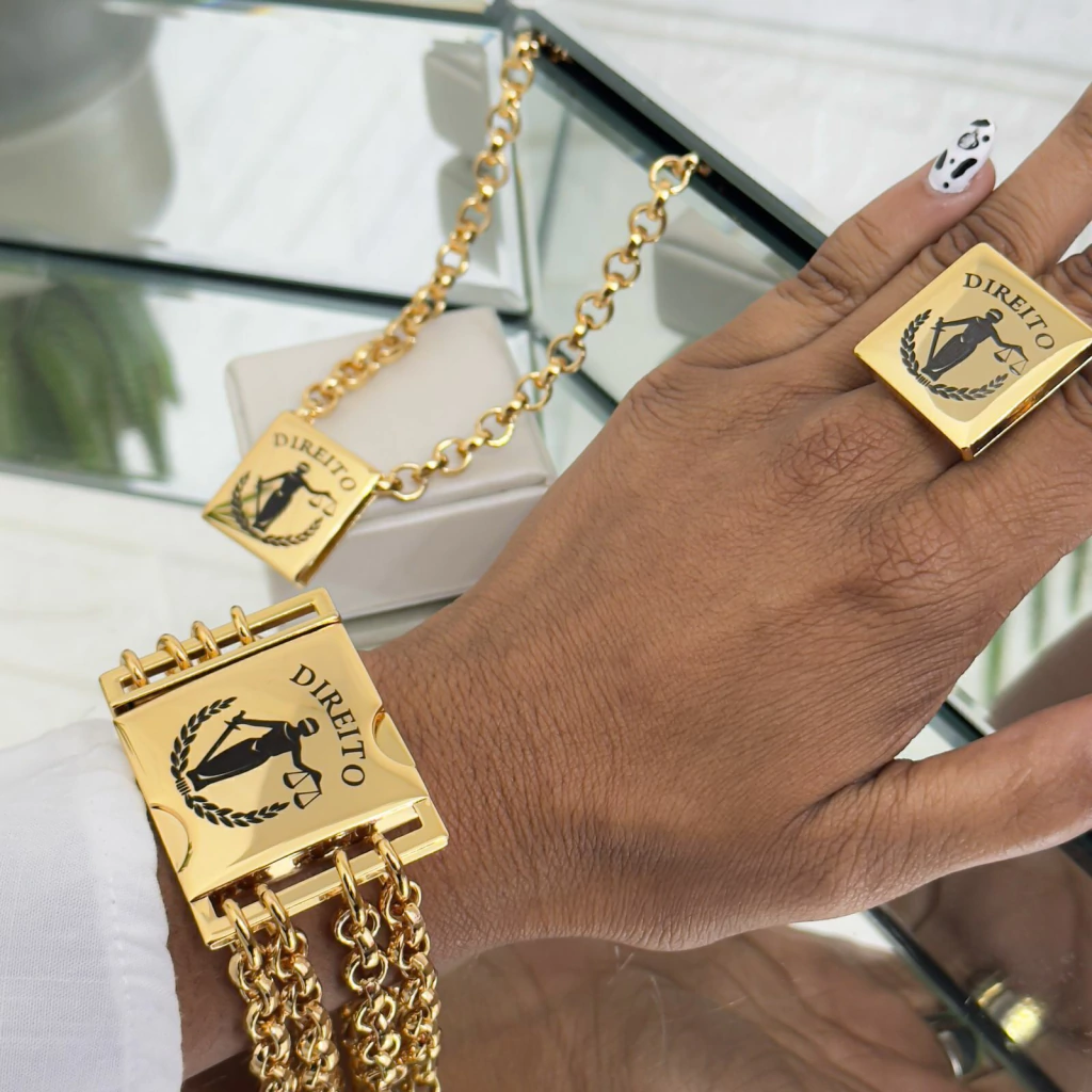 O Conjunto de Colar, Pulseira e Anel Dourado é a escolha perfeita para quem busca sofisticação e personalização. O colar, com placa dourada na corrente elo português grossa e acabamento em fecho lagosta, mede 50 cm, trazendo elegância ao visual. A pulseira, com 4 voltas na mesma corrente e fecho encaixe, também possui uma placa gravada com a profissão que você desejar, personalizada a laser. O conjunto ainda inclui um anel regulável de placa personalizada, com a profissão gravada. Tanto a pulseira quanto o anel podem ser feitos sob medida. Envie sua medida e profissão desejada pelo WhatsApp: 21 97608-1720 e tenha um conjunto exclusivo e único, feito especialmente para você!