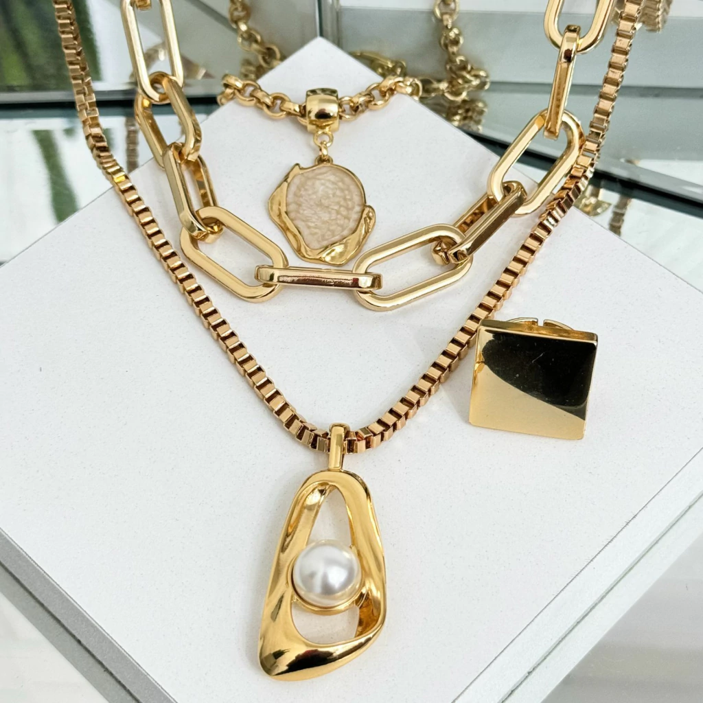 Esse conjunto traz a pureza de uma pérola solitária envolta em banho dourado, criando uma combinação encantadora e feminina. Ideal para quem ama acessórios delicados com um toque especial.