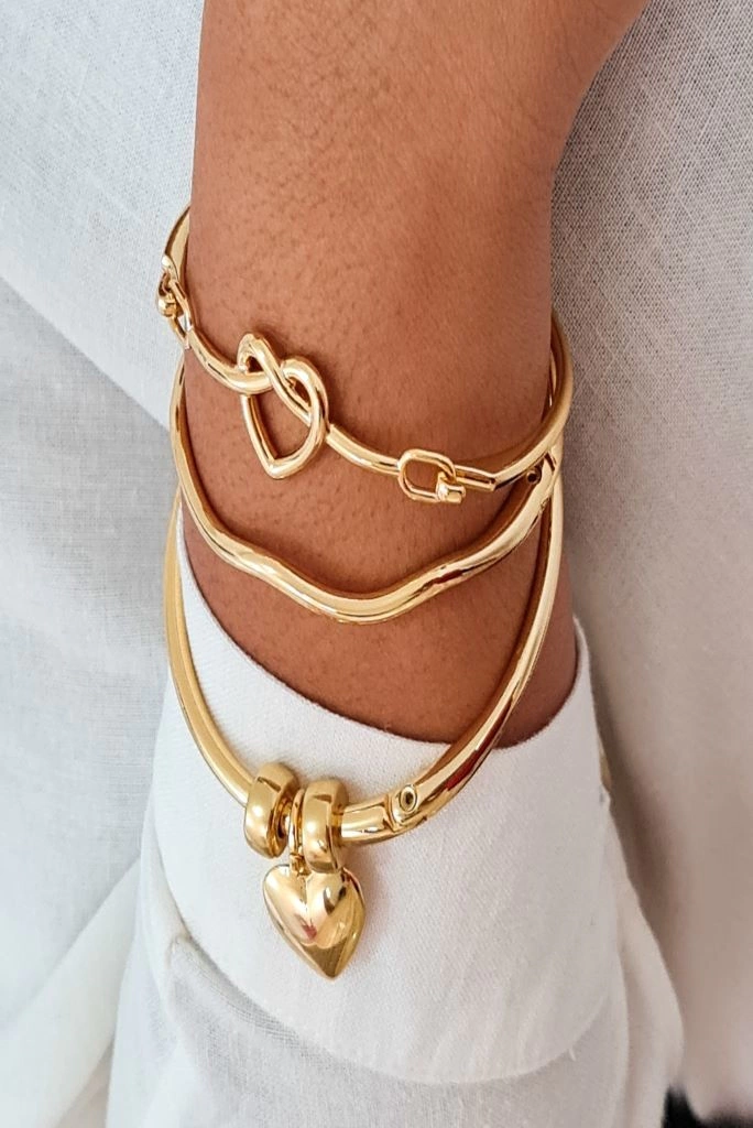 Este bracelete elegante é confeccionado em dourado, apresentando um design clássico com um acabamento em fecho encaixe que garante segurança e praticidade. O detalhe de coração vazado adiciona um toque romântico e delicado à peça.