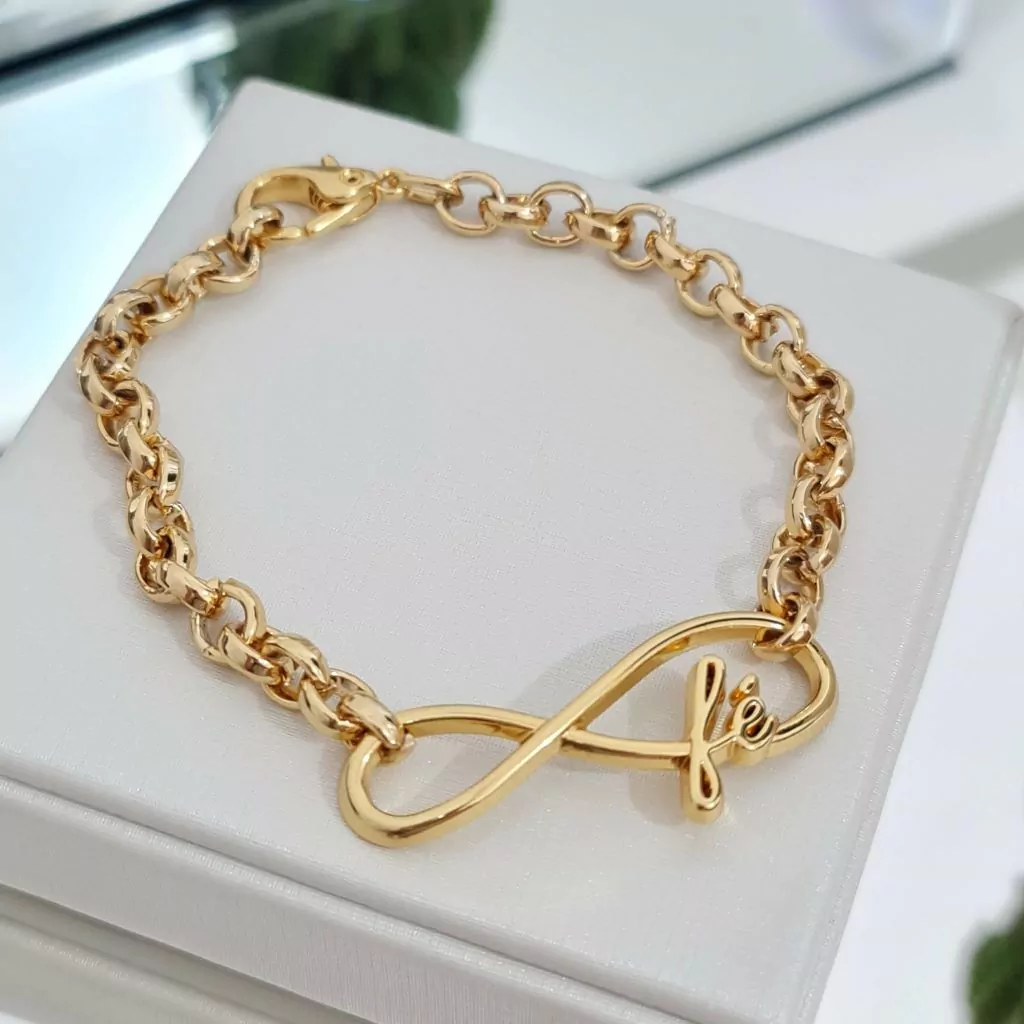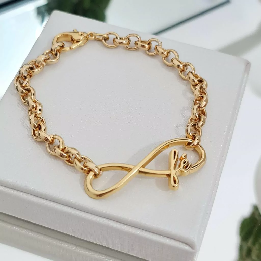 Esta pulseira robusta é feita em corrente elo português grossa, conferindo um visual elegante e duradouro. Com acabamento em fecho lagosta, garante segurança e conforto ao usar. O pingente de infinito, adornado com a escrita "FÉ", adiciona um toque significativo e inspirador à peça, simbolizando a fé que nos guia.