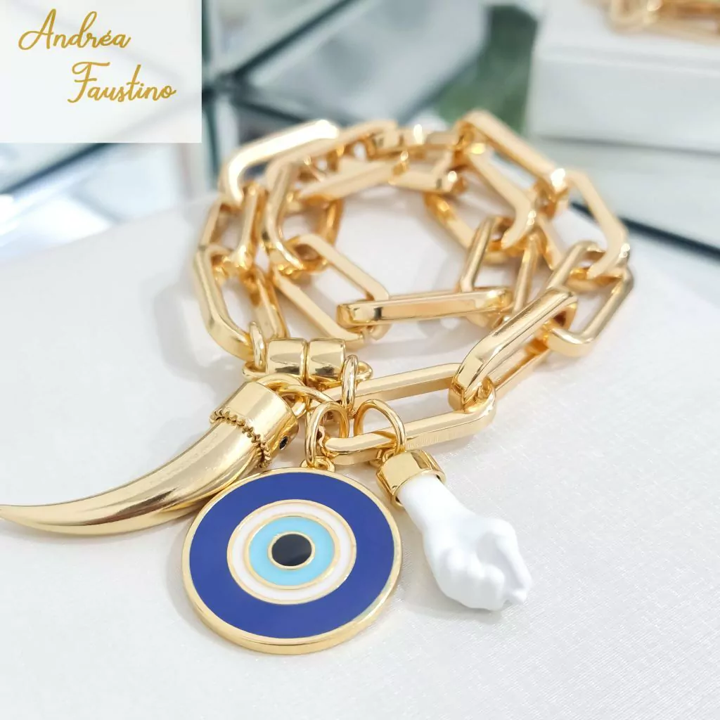 Esta pulseira robusta é feita em corrente de elos grossos, oferecendo um visual forte e contemporâneo. Com acabamento em fecho ímã, proporciona praticidade e segurança ao usar. Adornada com pingentes de olho grego, dente de sabre e figa branca, a peça combina proteção e estilo.