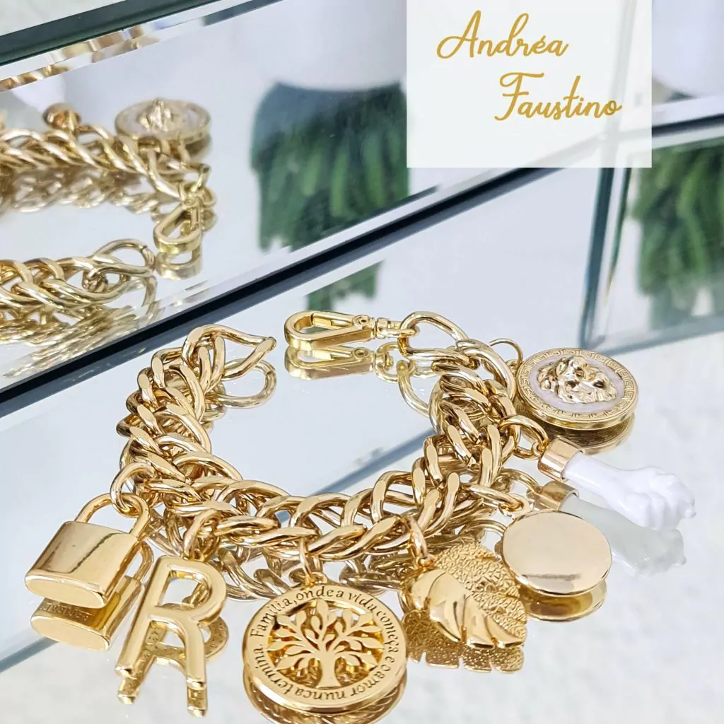 Esta pulseira dourada, com corrente max grossa, destaca-se pelo design robusto e moderno. O fecho lagosta oferece segurança e praticidade. A peça é adornada com diversos pingentes: um cadeado, inicial personalizada, medalha da Árvore da Vida, folha texturizada, medalha dourada, figa branca e medalha com estampa animal print. Cada pingente adiciona simbolismo e estilo, tornando a pulseira única e cheia de personalidade, ideal para quem busca um acessório marcante e significativo.