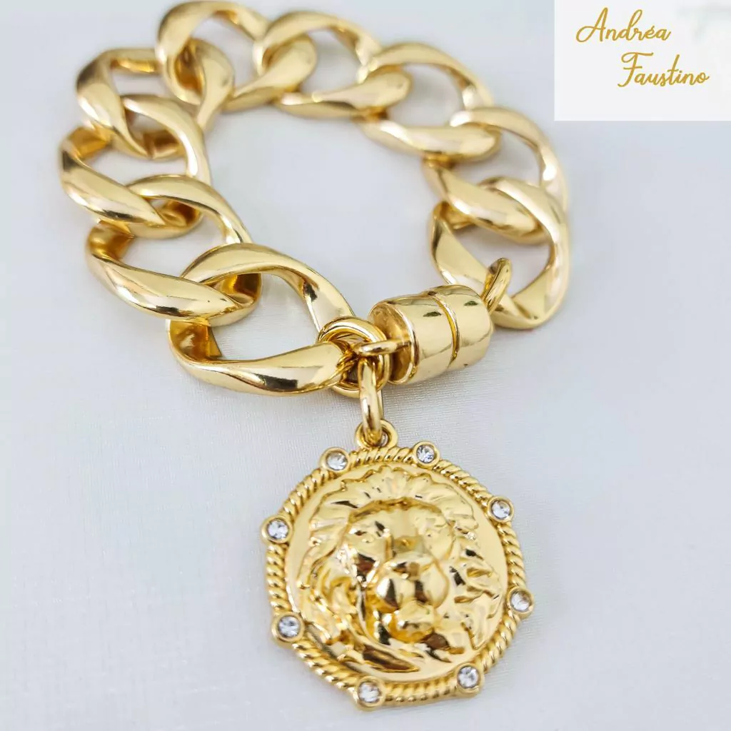 A pulseira dourada apresenta uma corrente de elos largos e batidos, conferindo um toque de robustez e elegância. O acabamento em fecho ímã facilita o uso, garantindo segurança e praticidade. O destaque fica por conta do pingente em formato de medalha com estampa Animal Print, adornado com strass, que adiciona um charme especial e um toque de brilho à peça.