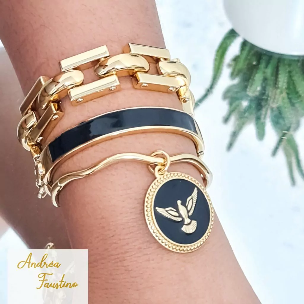 Apresentamos um conjunto sofisticado de pulseiras e braceletes. A pulseira dourada em corrente de gomos é complementada por um bracelete ondulado que traz um toque de moda e o destaque fica por conta do pingente de medalha pomba da paz preta, simbolizando harmonia e serenidade. Para completar, o bracelete grosso preto adiciona um contraste ousado e moderno ao conjunto.