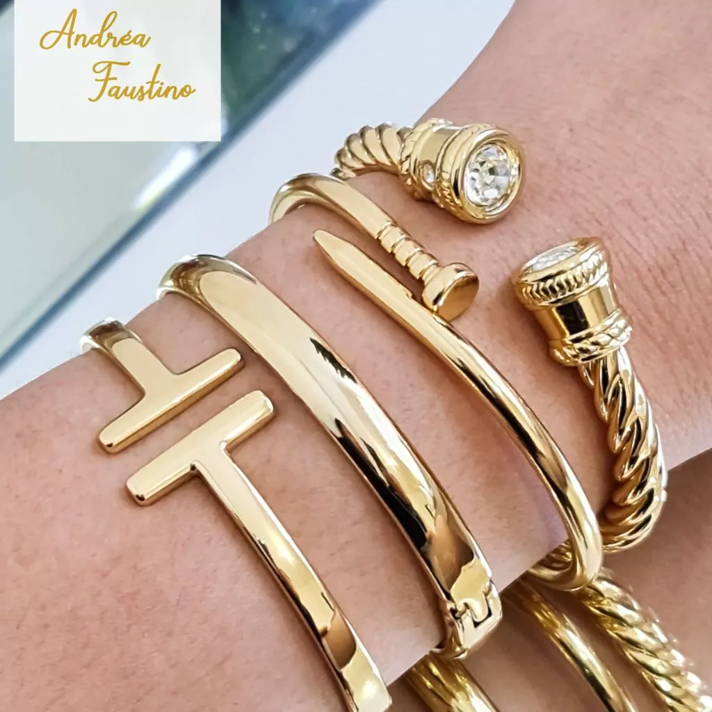 Braceletes dourados nos modelos torcido, liso, fashion e prego!