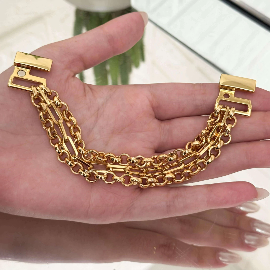 Essa pulseira foi criada para quem busca originalidade e estilo em dose máxima. Composta por duas voltas de elo português grosso e uma volta de elos retangulares, ela se destaca pela combinação de texturas e pelo design sofisticado. O fecho magnético garante praticidade e segurança, enquanto o banho em verniz protetor assegura brilho intenso e durabilidade.