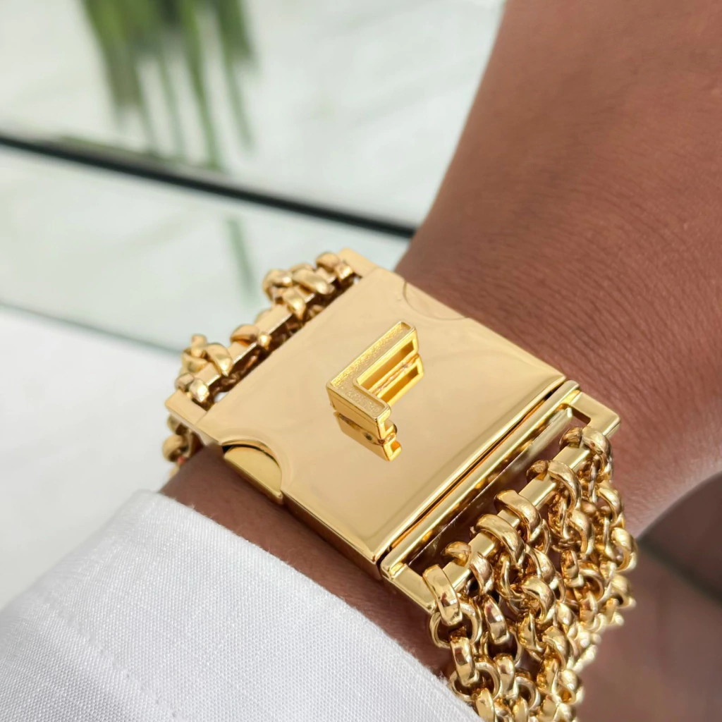 Essa pulseira dourada de várias voltas é uma peça elegante e moderna, com um fecho em encaixe que garante segurança e conforto. A placa central oferece um espaço para personalização, permitindo que você escolha a inicial que desejar, tornando-a única e especial. O design de várias voltas confere movimento e dinamismo à pulseira, tornando-a ideal para ser usada sozinha ou em combinação com outras peças.