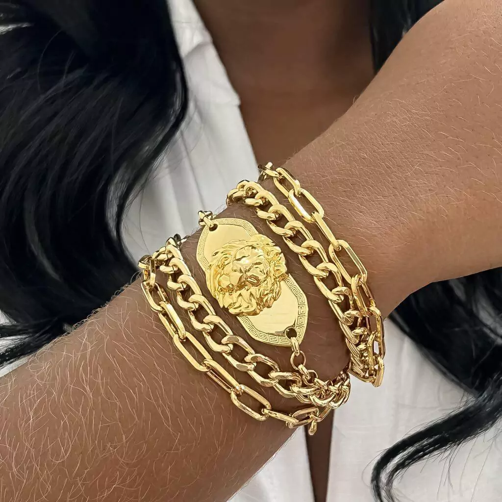 Essa pulseira dourada de várias voltas é uma peça cheia de estilo e personalidade, combinando correntes retangulares e de elos em um design contemporâneo e dinâmico. O pingente em forma de medalha com estampa animal print traz um toque ousado e fashion, perfeito para quem ama um visual marcante.